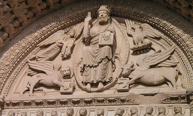 Crédito: (*) Foto: Detalle del portal de San Trophime en Arles, Francia. Cristo en el centro está rodeado por los símbolos de los Cuatro Evangelistas: de izquierda a derecha, Marcos (león), Mateo (humano), Juan (águila) y Lucas (buey). Debajo, se encuentra la fila de los doce apóstoles. Autor: Rolf Süssbrich, 22 de julio de 2007. Licencia: Creative Commons Attribution-Share Alike 3.0 Unported.