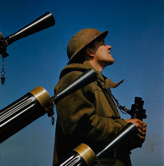 Crédito: (*) «The Royal Navy in the Second World War TR100.jpg» por Royal Navy official photographer, con descripción «A sailor on watch, wearing a duffle coat, steel helmet and holding a pair of binoculars, beside a quadruple Vickers 0.5in anti-aircraft gun, 1942», liberado bajo la Licencia no comercial del Imperial War Museum (IWM Non Commercial Licence). Esta imagen está en el dominio público debido a que fue creada por el Gobierno del Reino Unido y se encuentra bajo la normativa de Crown Copyright, que expira 50 años después de su creación.