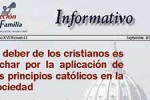 El Informativo de Acción Familia de Septiembre de 2015 trae, en su versión PDF descargable, las siguientes materias: * Aborto: ¿Se ha de imponer a la mujer no católica los principios enseñados por la Iglesia? * La buena mesa hace buenos amigos * Campanas que resuenan dentro de nuestro corazón * ¿Abogó San Francisco por un Culto